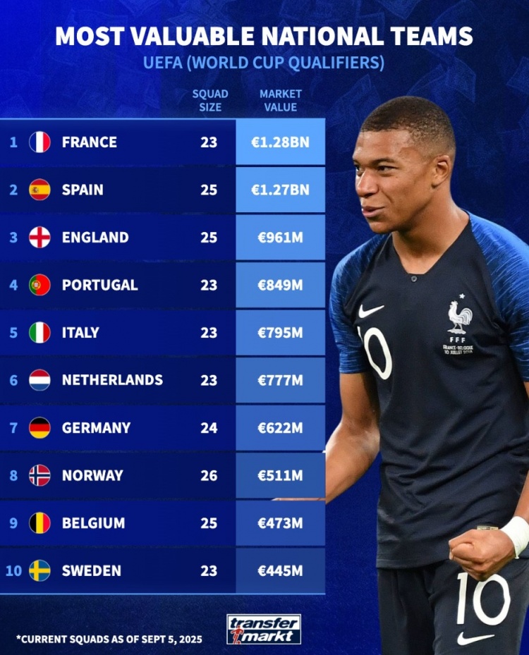 直播吧9月6日讯 世欧预正在进行中,《转会市场》也统计了本期欧洲国家队阵容身价情况,法国力压西班牙居首。